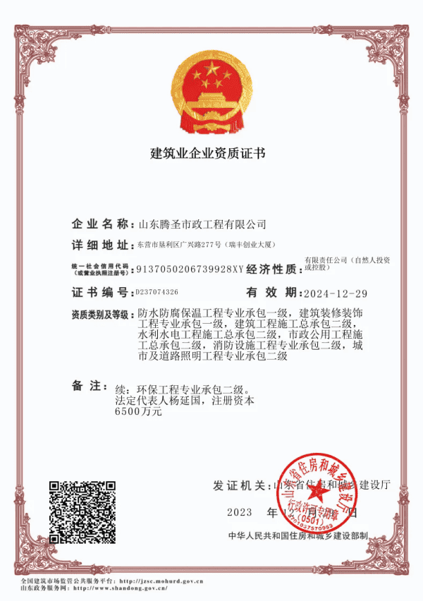 山东腾圣市政工程有限公司,成立于2013年5月,公司注册在黄河入海口中心城市、黄蓝战略交汇地东营市垦利区,实缴资本陆仟伍佰万元整。腾圣市政工程公司本着...