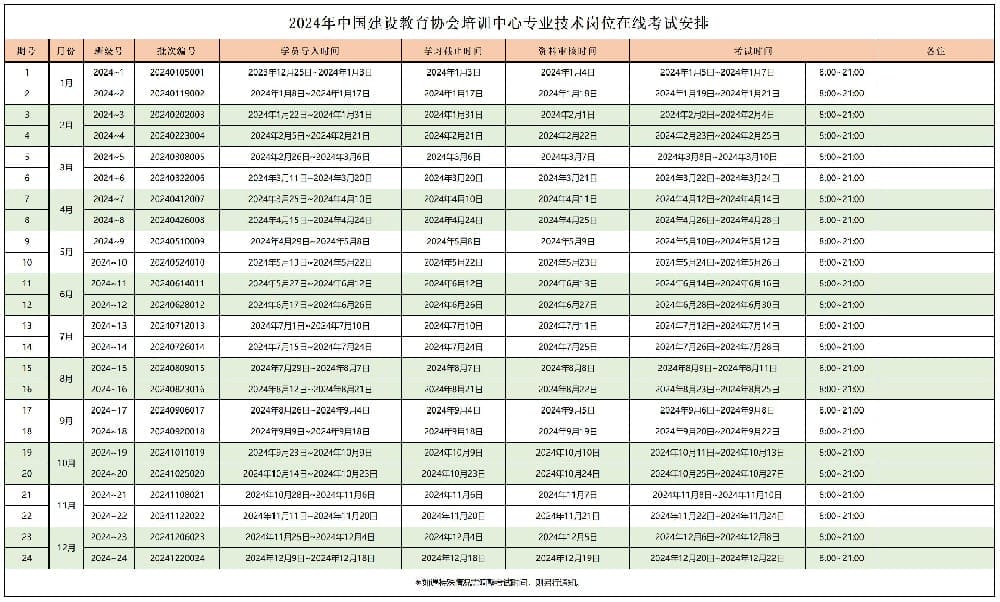 2024年中国建设教育协会培训中心专业技术岗位在线考试安排期号月份班级号批次编号学员导入时间学习截止时间资料审核时间考试时间备注11月2024~120...