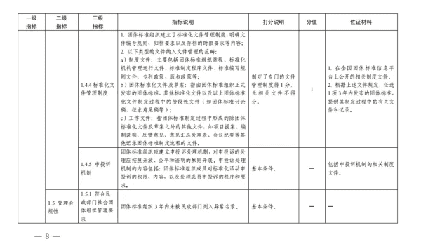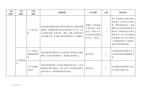 二、团体标准组织应按照《指标体系》于2024年12月31日前完成自我评价,并通过全国团体标准信息平台公开评价结果,评价结果应客观真实。新成立的团体标准组织应于团体标准发布之日起3个月内完成自我评价并公开结果。未达到任意一项基本条件的团体标准组织,建议暂停或终止团体标准制定工作,积极对照《指标体系》进行改进,或与有能力的团体标准组织联合开展团体标准化工作。
