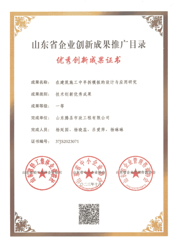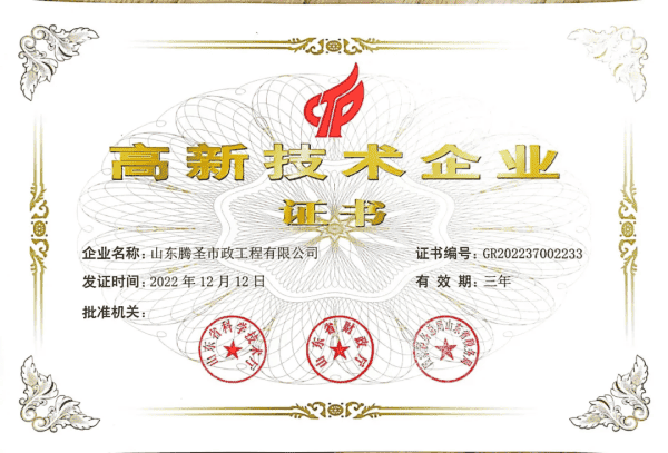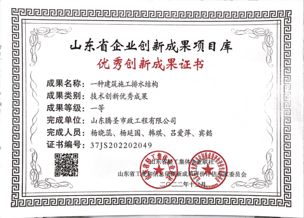 腾圣市政工程公司虽是工程施工类企业,但并不满足现状,在各级住建、科技、工信部门的关心支持下、在董事长的谋略和指挥下,公司重视企业创新发展,加大科研投入、在施工中不断总结、创新。公司近几年投入的研发经费占公司总收入的6-7 %。巨大的投入获得了可喜的成果:公司先后申请注册了22项国家专利;其中2项发明专利、20项实用新型专利;7项软著;现在正在申请的还有4项发明专利和1项实用新型专利。公司于2019年被国家科技部授予全国科技型中型企业,2021年东营市授予市级专精特新企业;2022年获得省级专精特新企业称号;2022年12月公司获批高新技术企业;2023年被评为东营市优质企业。近年来,公司加大了研发投入,2022年公司研发的科技创新项目获得中国商业联合会科技创新奖一项、山东省轻工联社技术创新优秀成果一等奖、二等奖、三等奖各一项。2023年公司研发的科技创新项目分别被评为山东省轻工联社技术创新优秀成果一等奖和二等奖;2023年11月公司研发的水电开槽机和储油罐腐蚀在线监测系统分别被山东省住建厅和山东省工信厅立为省科技创新项目。