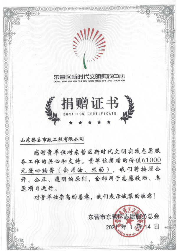 企业的发展跟政府的支持和社会的关心分不开的,腾圣市政工程公司始终怀着一颗感恩的心,时时刻刻都在用自己的实际行动诠释企业的社会责任与担当。2020年新年伊始,新冠肺炎疫情初发时期,腾圣公司在董事长的带领下向垦利区慈善总会捐款10万元,用于为奋战在抗疫一线的防控人员购买防疫物资。2020年7月,腾圣市政工程公司为解决垦利区当时的财政困难,为区应急管理局出资购置价值150万元的应急救援车一辆,用于抢险救援、应急施工。 腾圣市政工程公司热衷于做公益,每年慰问敬老院、福利院、退伍老兵、孤寡老人;在董事长的带领下,公司选定了永安镇退役军人袁洪水等3名家庭贫困的退役军人为固定帮扶对象,通过各种方式、定期去慰问、帮扶。据不完全统计,这些年公司通过各种方式向政府、社会捐赠超过300万元的现金和物资。被东营市垦利区慈善总会授予爱心企业;东营市垦利区退役军人事务局授予拥军优属爱心企业和爱心个人;获得:垦利区工商联优秀会员企业等荣誉称号。