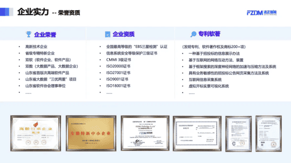 法正智能作为行业内首批独立研发并实施运营第三方招标采购交易平台的企业,已取得高新技术企业、双软企业核心认证,在电子招投标领域拥有近百项软件著作权和专利证书。为中国招投标协会理事单位、山东省软件协会常务理事单位、山东省大数据协会理事单位。目前已通过全国最高等级的 “电子招投标系统交易平台信息系统安全三级等保测评”认证、“EBS三星检测”认证及“CMMI3软件能力成熟度认证”等。