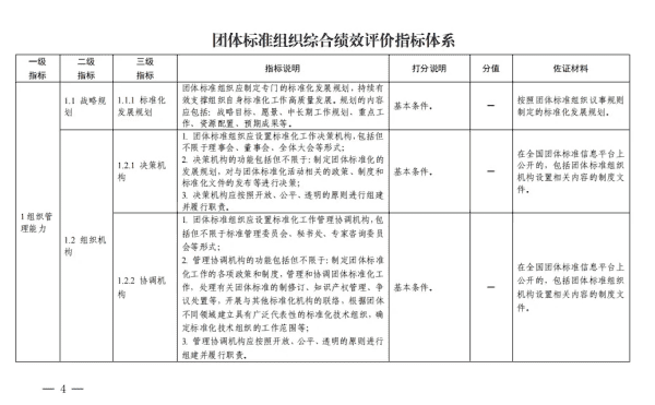 为深入贯彻落实《国家标准化发展纲要》,引导团体标准组织(制定团体标准的社会团体)制定原创性、高质量标准,促进团体标准规范优质发展,国家标准委组织编制了《团体标准组织综合绩效评价指标体系》(以下简称《指标体系》)。现印发给你们,并就有关工作通知如下:
