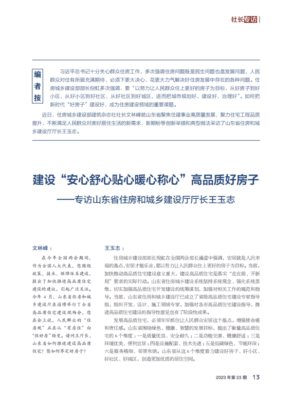 近日,住房城乡建设部建筑杂志社社长文林峰就山东省聚焦住建事业高质量发展,聚力住宅工程品质提升,不断满足人民群众对美好居住生活的新需求、新期盼等创新举措和典型做法采访了山东省住房和城乡建设厅厅长王玉志。