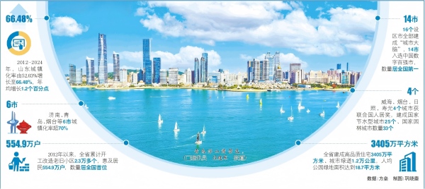 回望2012年,山东城镇化率仅为52.03%;如今,全省常住人口达1.008亿,城镇化率以年均1.2个百分点的速度稳步增长,至2024年已达66.48%。城镇人口年均增长138万人,总量达到6701万人,居全国第二位,山东已成为推动全国城镇化水平稳步提升的重要力量。